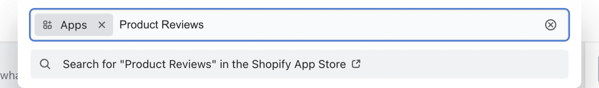 A search bar will appear where you can type your app name. We’ve shown the example for Shopify’s in-house app, Product Reviews.