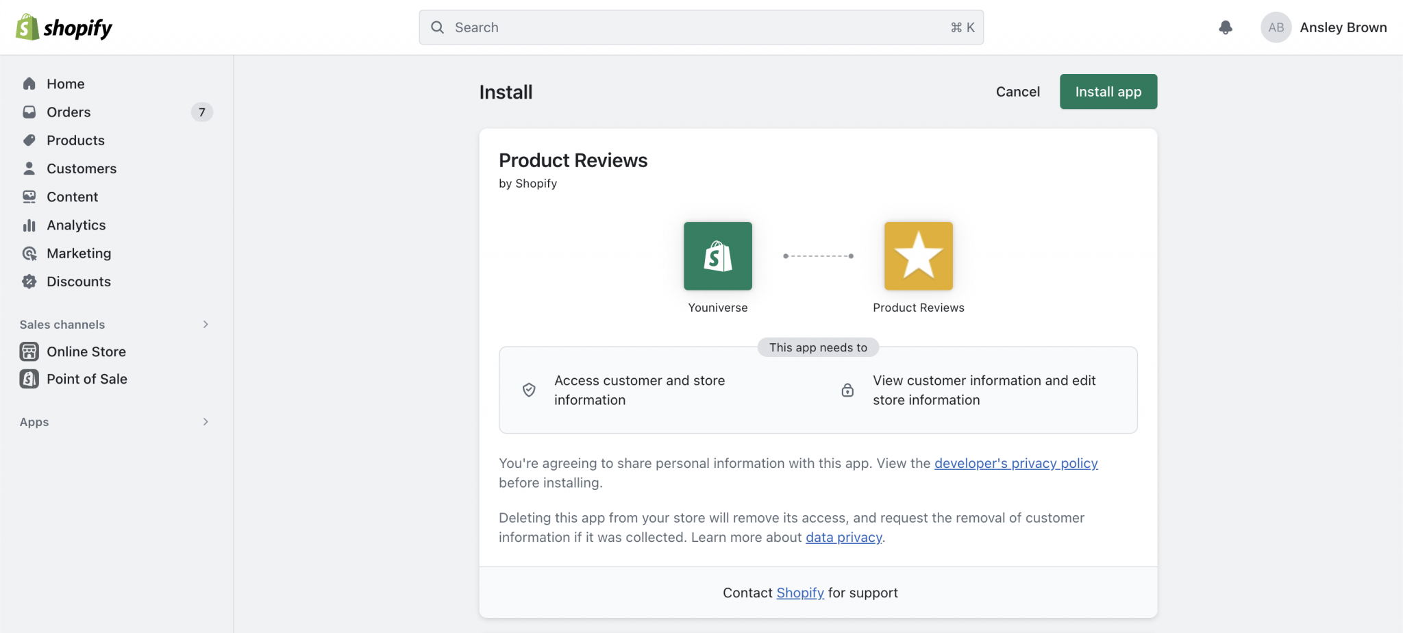 As soon as you log in, you can see all the permissions the Shopify app requires after installation. Click the Install app button and wait for the installation process (it hardly takes a minute).