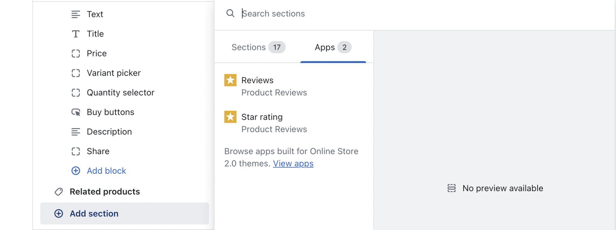 Click Add section and scroll again down to where the Apps sections are. For Product Reviews, you’ll have the option to add Reviews or Star ratings (or both).