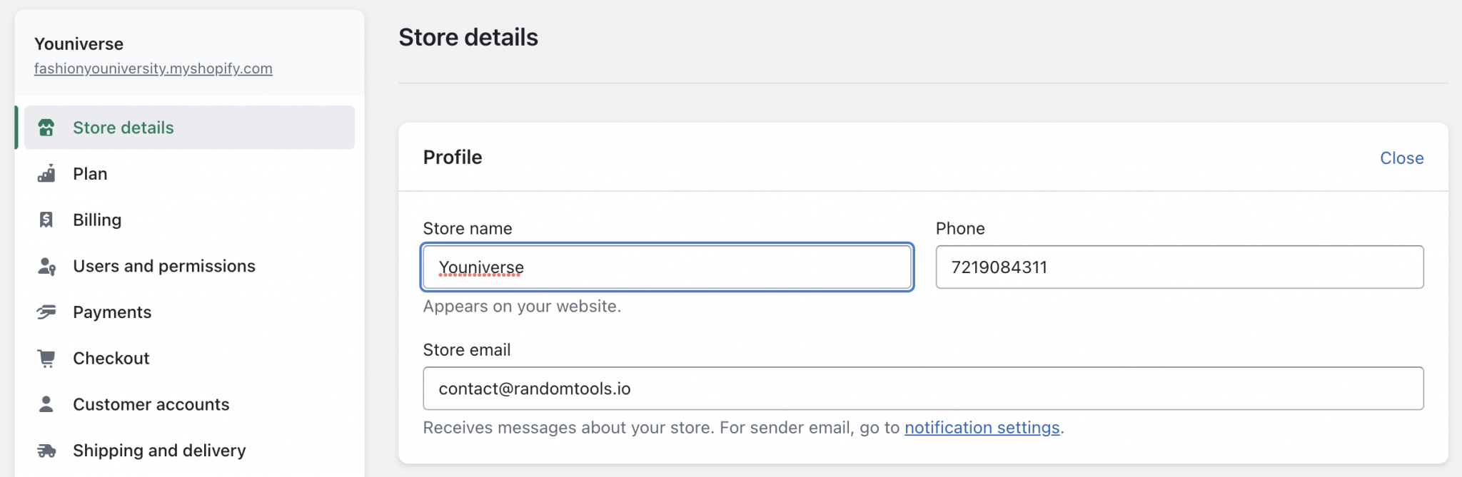 Head over to your Shopify admin settings and select store details. Now enter your new store name and click save.
