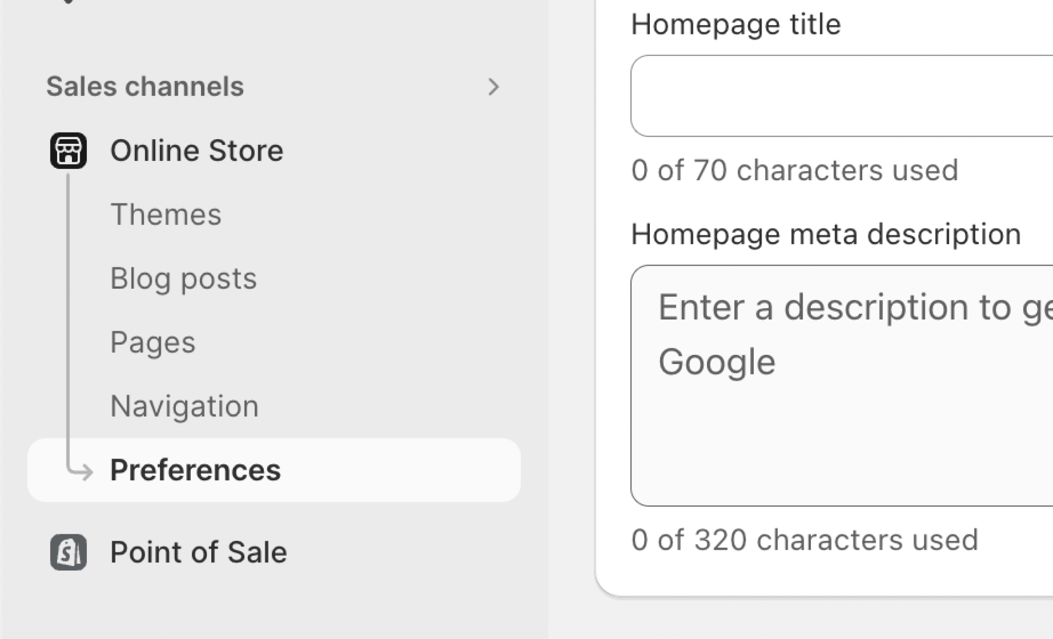 Head to your Shopify Admin dashboard, select Online Store in the left side menu and select Preferences.