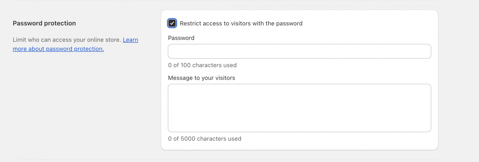 Under the Password protection section, you can craft a custom message for all the visitors that’ll land on your Shopify store. Although that’s the only feature you’ll get when it comes to the password page option on Shopify.