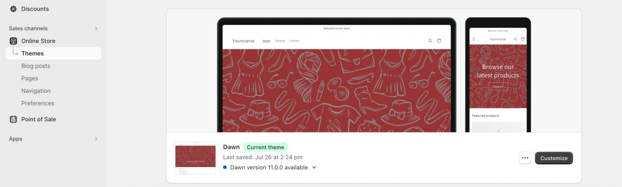 Head back to your Shopify admin dashboard, and select Online Store from the left side menu. Click on themes to open your active theme section and click Customize.