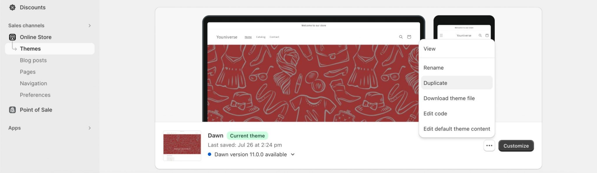 Click on the three dots beside the customize button and select Duplicate from the drop-down menu. Doing this will create a duplicate theme in your theme library for your now available-to-customize Shopify Coming Soon page.