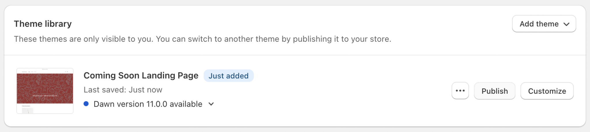 You can now head to your new theme in the theme library. Click the three dots from which you can select Publish to make it your current Shopify theme.