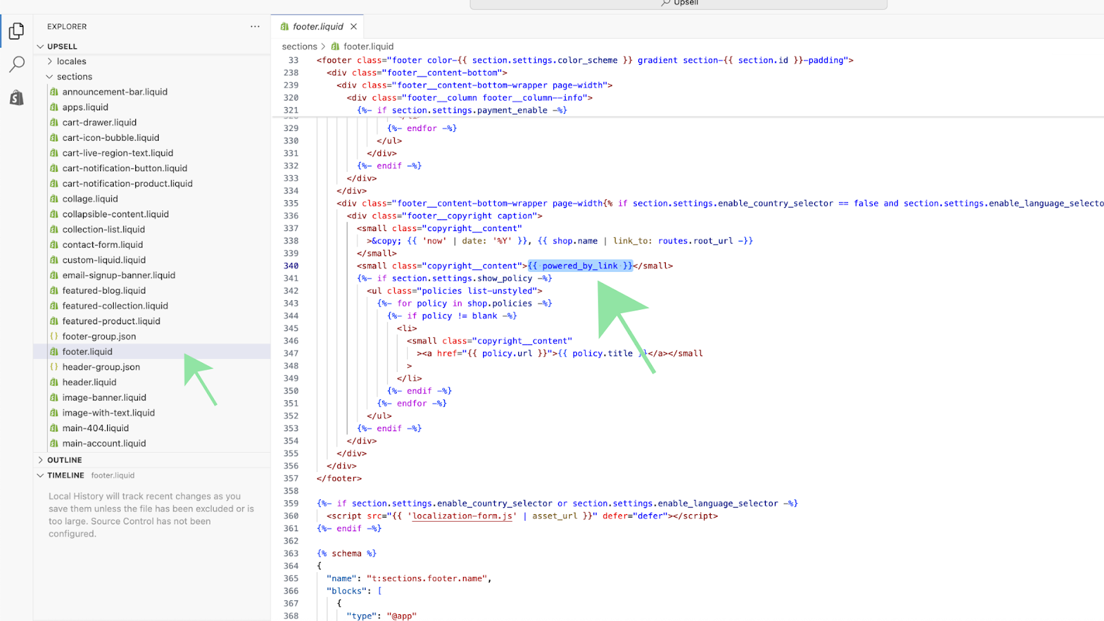 - Under the Sections tab in the explorer, locate the file named footer.liquid.