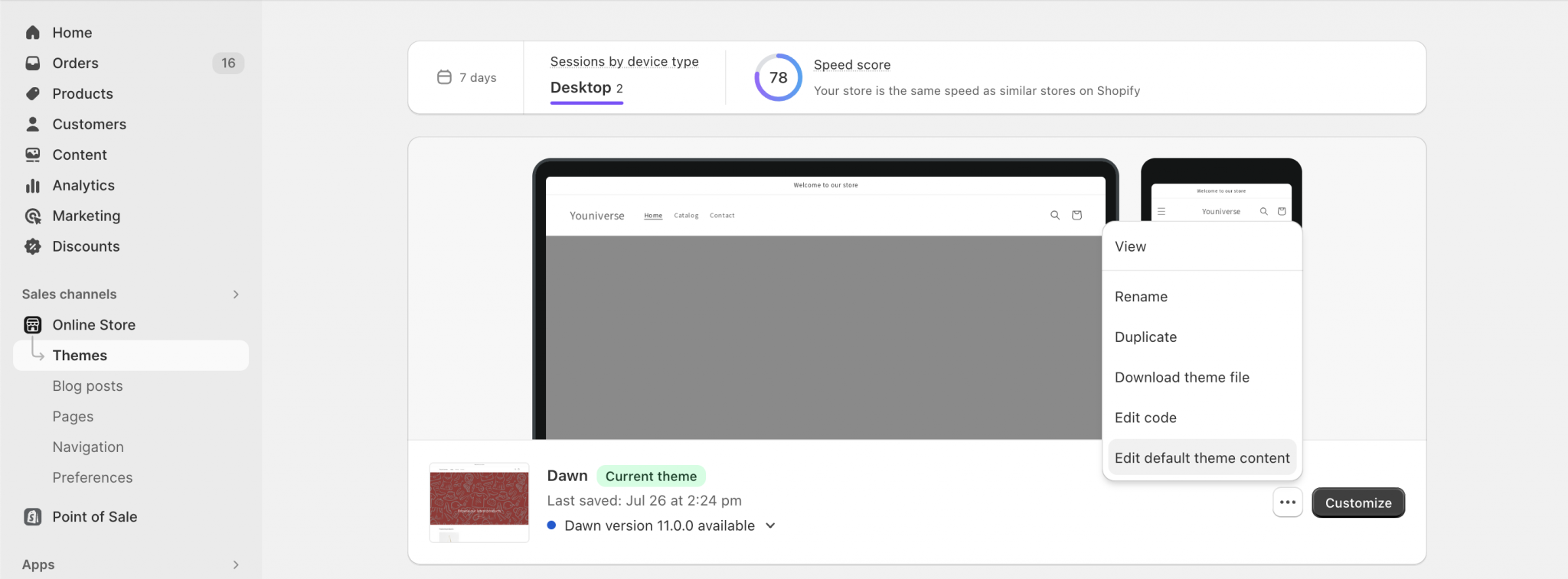 Navigate towards the three dots beside the Customize option in the themes section of the store and select Edit default theme content to proceed after a menu is revealed.