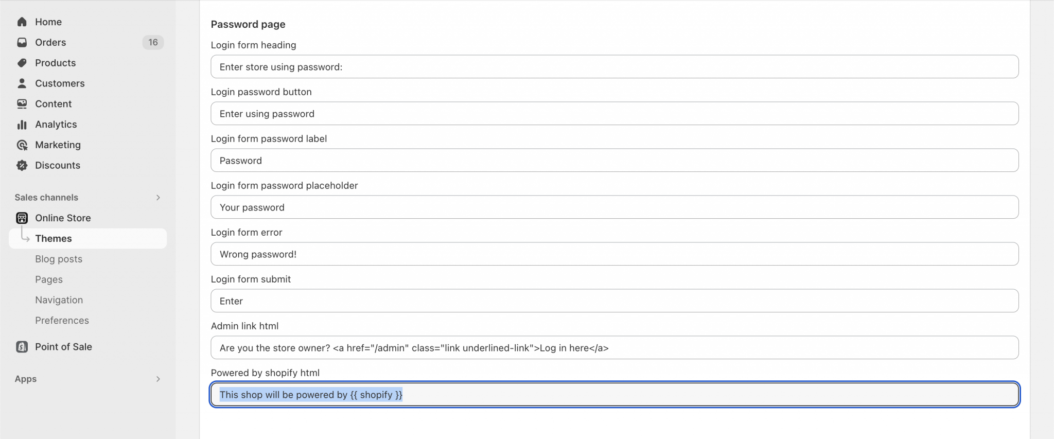 Note: For a password page, you must change the text and include a call-to-action link from the HTML editor.