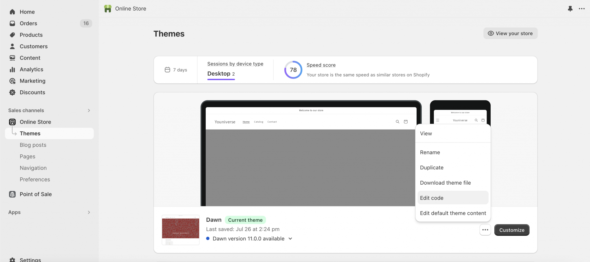 Navigate towards the three dots beside the Customize option in the themes section of the store and select Edit code to proceed after a menu is revealed.