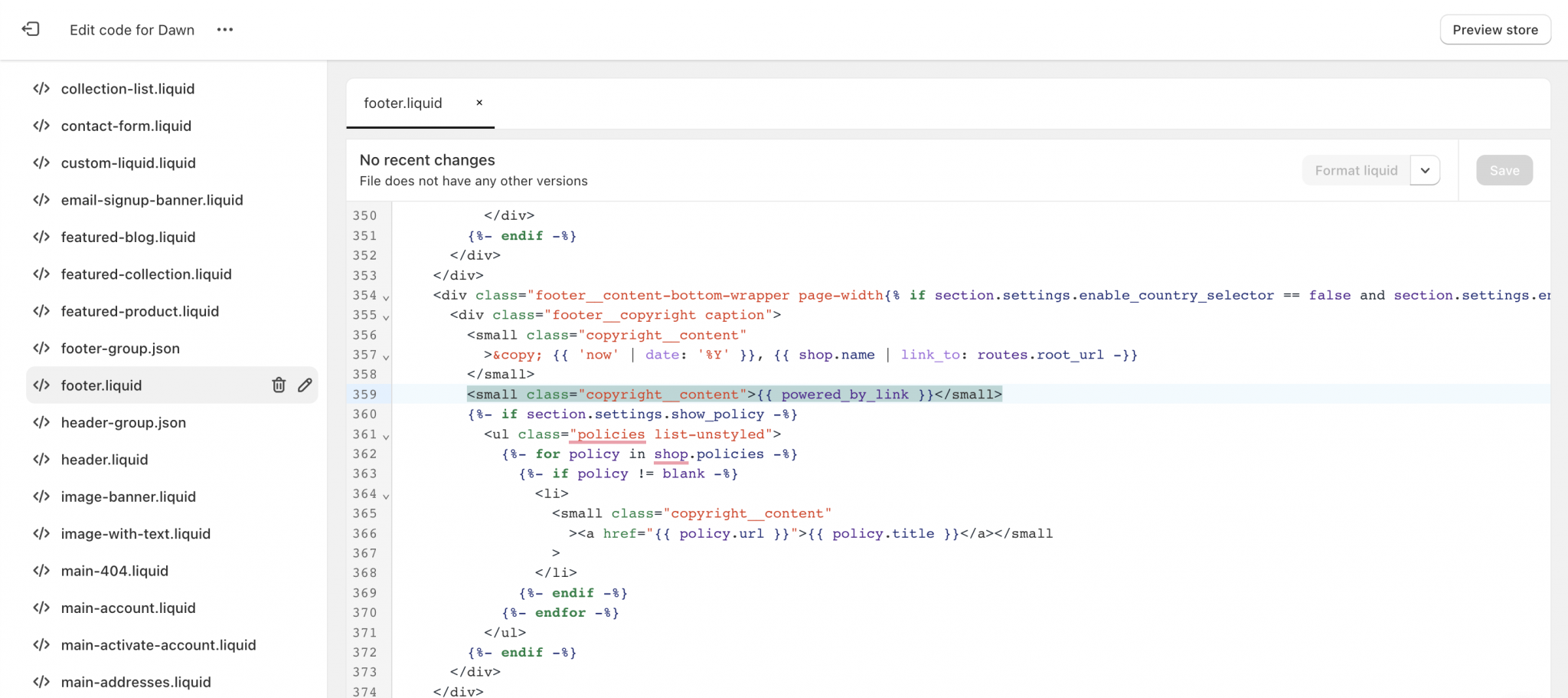 Now find the powered by Shopify HTML section, select the ‘This shop is powered by {{ shopify }}‘ section, and remove the text.