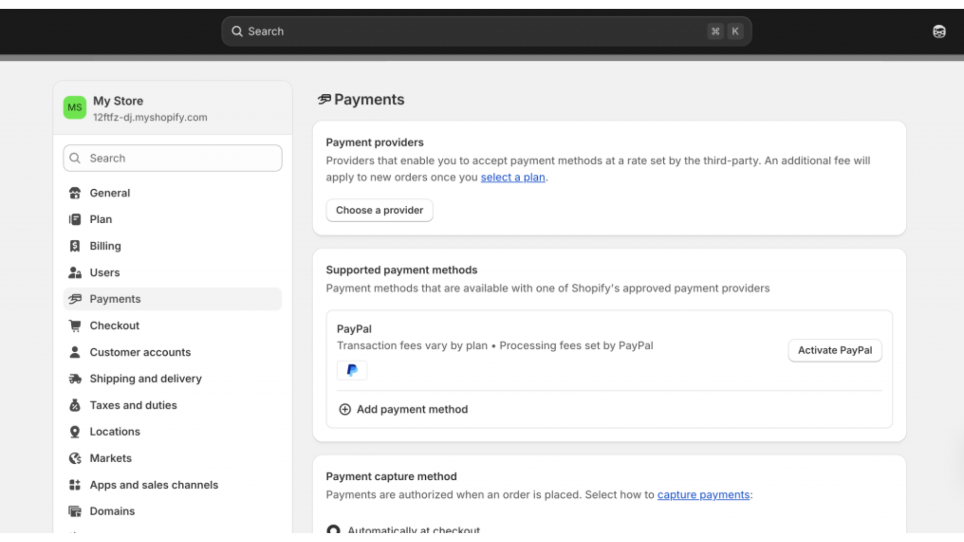 Go to Shopify Admin > Settings > Payments > Add payment method to activate your preferred payment gateway.