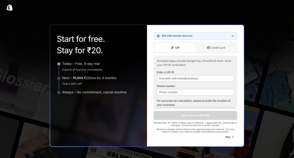 Hit Create Shopify Account to select the plan. You can go with Shopify’s 3-day free trial (no credit card required) to explore the platform and begin setting up your store without waiting for any unnecessary confirmations. Just hit the Skip button below if you’re yet to decide.