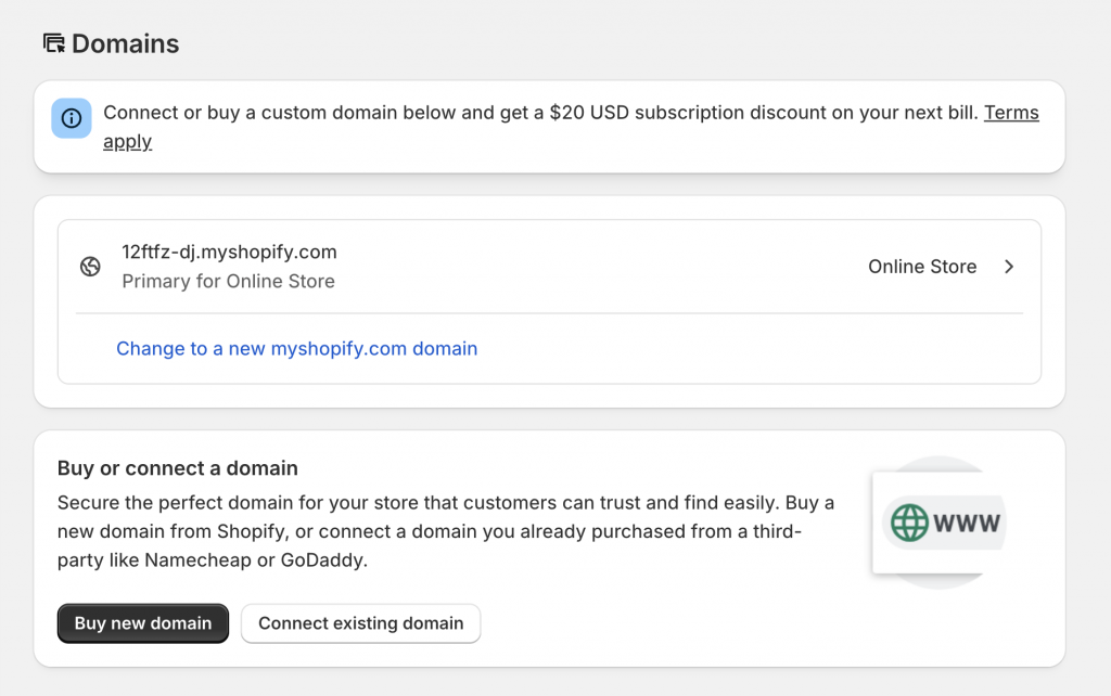 You can purchase a Shopify domain for automatic configuration or transfer an existing domain with guided DNS setup. Just visit Settings > Domain > Buy New Domain.