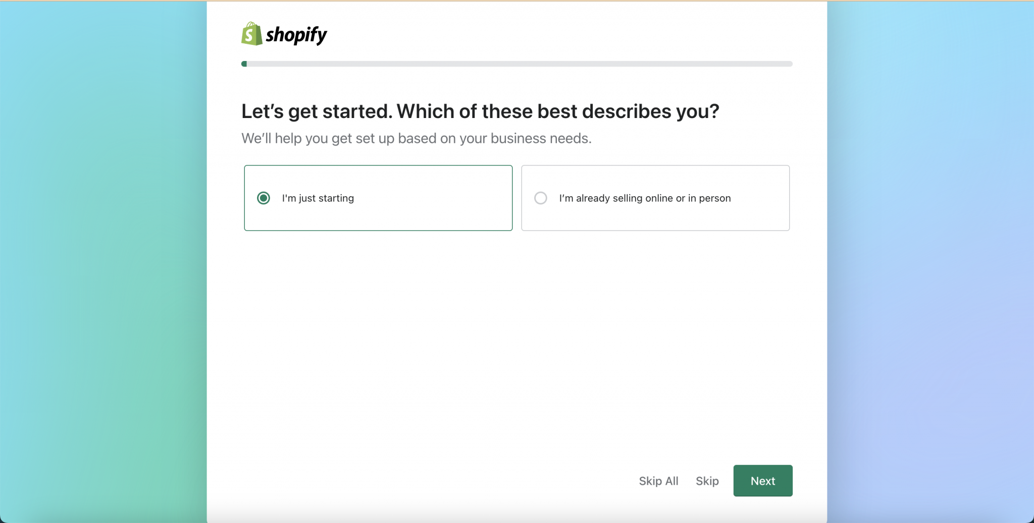 Now Shopify will ask a few questions about your business, and you can complete the setup after answering all of them.
