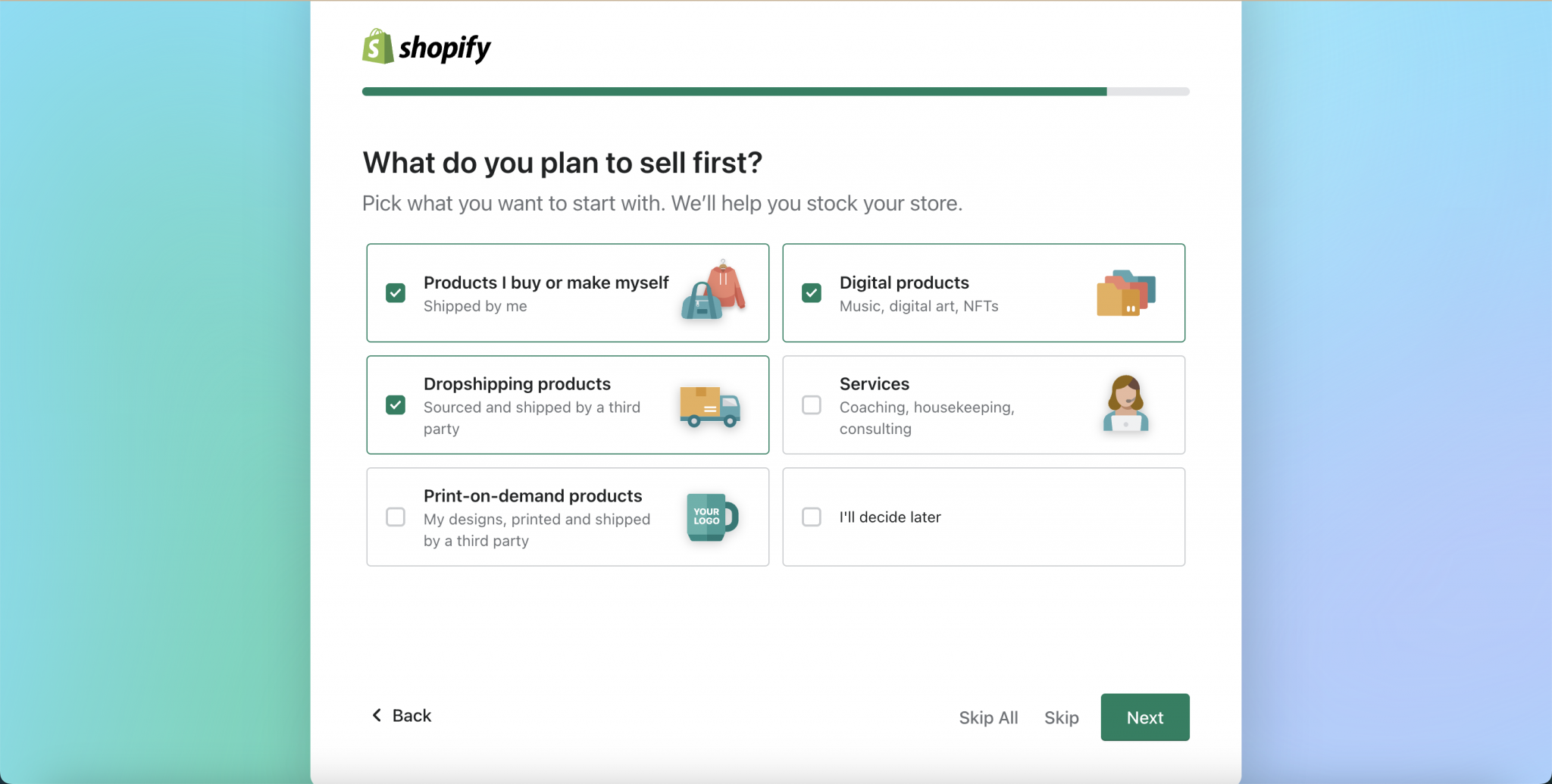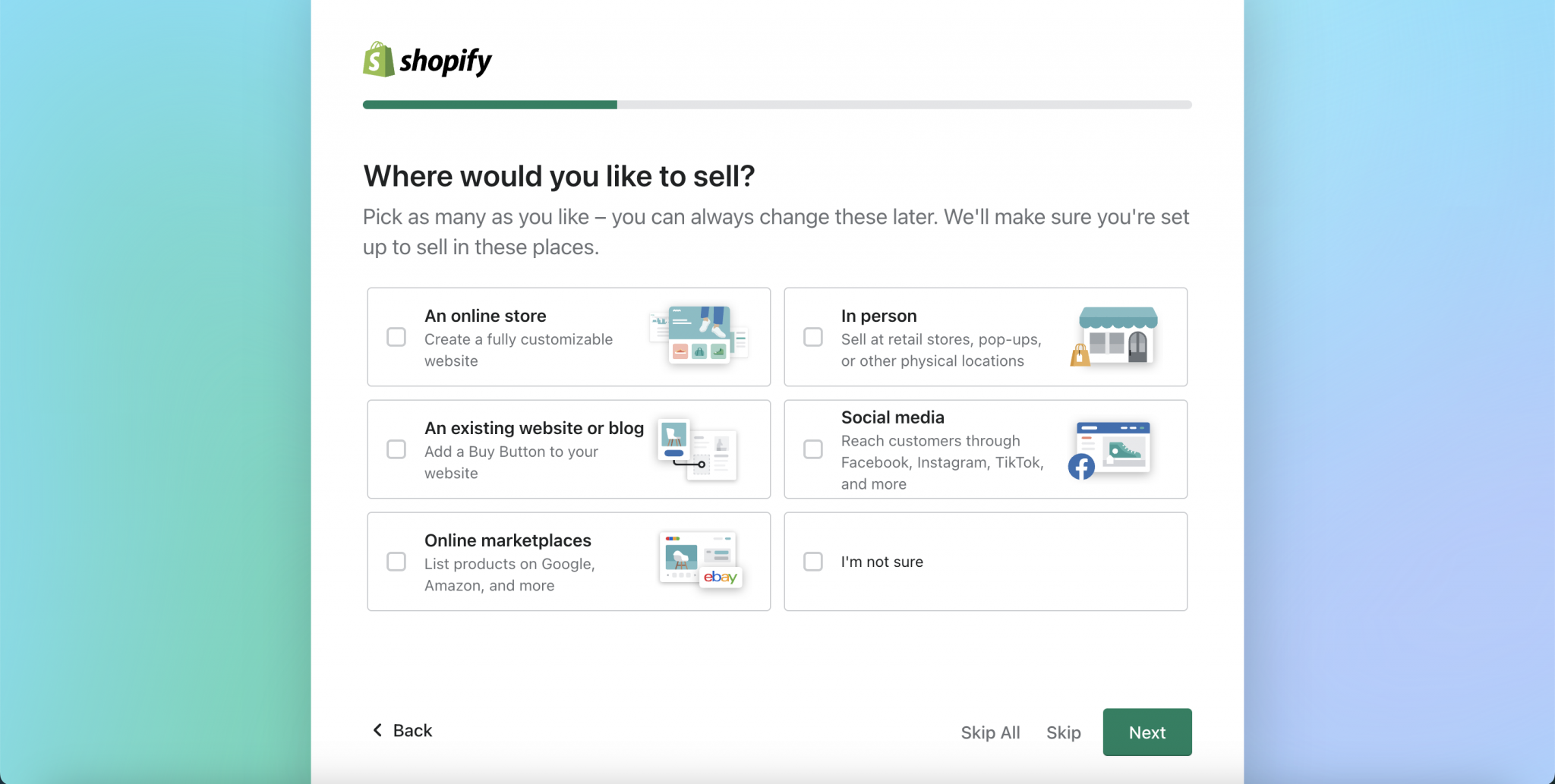 Let Shopify know where you’re planning to sell your products: Could be an online store with social media, physical and online, or an online marketplace.